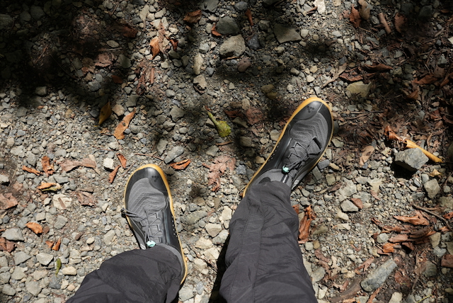 途中で、バックパックのショルダーと、シューズのストラップを、よりタイトに締めてみた。ブレがなくなり、歩きがより硬質になった。メカニカルに、より体の中芯を使うダイレクトな歩行になった。VivobarefootのPrimus Trail Knitはスリッポン構造で緩く履けるため、どうしても街にいる時のように緩く履いてしまう。だからこそ、シューレースをきっちり締めることが大事。しっかり締めるとまるで別の靴であるかのような体感が得られる。足首と甲の部分はしっかりと固定され、着地でブレないのに、指先は五本とも自由だ。それが心地よい。そして口を閉じて鼻呼吸。これも大事。