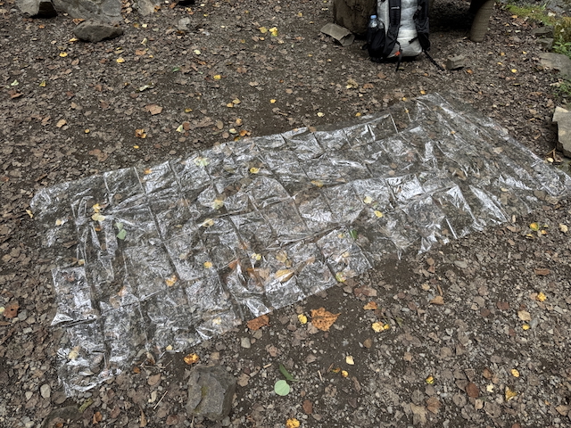テントを張って、温泉に入る。最近グラウンドシートをタイベックからポリクロに変えた。軽くて、使用した後のメンテも楽だ。使用後はバサバサと水気を切れば、汚れも同時に落ちる。耐久性はタイベックよりも低そうだが、初回の使用には耐えた。地面はフラットで、土と砂利混じりの張りやすいテント場だった。使用しているテント、HyperliteのMID1はグラウンドシートなしでも使用できるフロアの厚みがあるが、使用後の汚れ落としの手間を考えると、グラウンドシートを1枚敷いたほうが楽で、長持ちしそうだ。