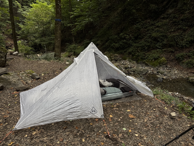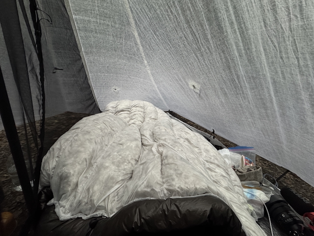 キルトは夏前に新調したEnlightened EquipmentのRevelation 20°F。カラーはTokimaru Tanaka別注。この日の気温は現地で最低8℃ほど。樹林帯と川のテント場だったため、気温変動は柔らかく、結露もほぼ無かった。トップのはヒアネスのドライウールTの上に、パタゴニアのナノパフを着た。体感はちょうどよく、途中で掛け布団にしたりして、キルトの機能を生かして快適に眠れた。