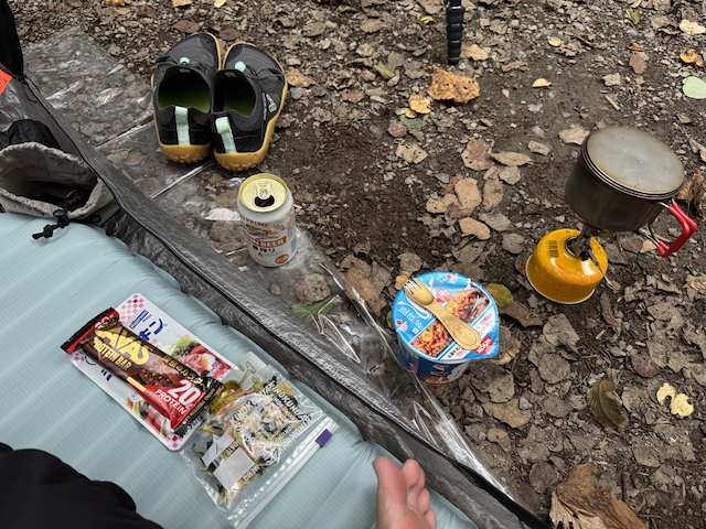 少し遅めの食事。カレー飯に、乾燥野菜、プロテインバーとシーチキン、オリーブオイル。最近の山でのお気に入りメニュー。