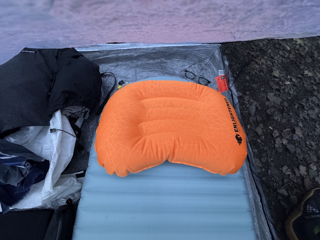 何より良かったのは、Enlightenedでキルトを買ったらおまけでついてきた、こちらのインフレータブルピロー。普通に買うと5、6千円ほどしそうな品質のものを無料で付けてくれるとはどれだけ太っ腹なんだEnlightened。テント泊の時の枕はいつも適当で、ザックを置いたり、服を適当にまるめたりしているのだけど、明らかに睡眠の質向上に役立つと思った。ピローの表面は心地よい肌触りで、裏面には滑り止めがあり、固定用のバンドもあることで、ラフに寝ても全くズレ落ちることがない。